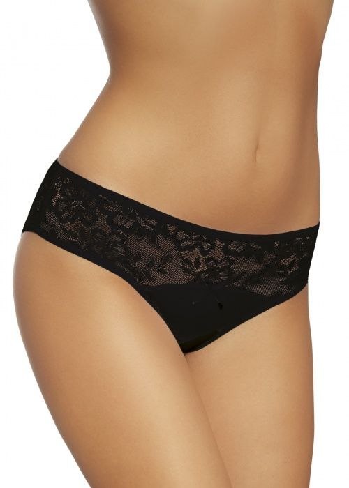 Subtelne figi wykonane z połączenia kwiecistej, elastycznej koronki i gładkiej bawełny. Góra koronkowa, z lekkim efektem prześwitu. Dół kryjący, zdobiony kokardką z przodu. Skład: 95% bawełna, 5% elastan.