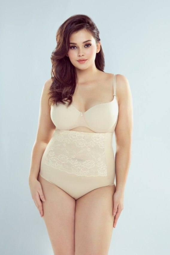 Wysokie figi korygujące talię i modelujące strefę brzuszka. Zdobione z przodu szerokim, koronkowym pasem. Dół cięty laserowo, dzięki czemu nie odznacza się pod ubraniem. U góry (od wewnętrznej strony) umieszczono silikonowy pasek, dzięki któremu bielizna nie zsuwa się. Skład: 85% poliamid, 15% elastan.