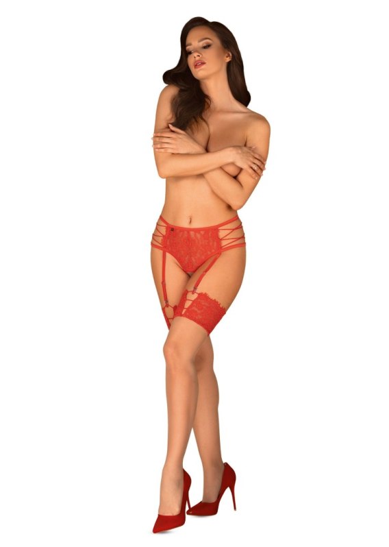 Czerwona koronka w niesamowicie kuszącym wydaniu... Rediosa czyli pas do pończoch połączony z majteczkami o pikantnym, otwartym kroku. Ze sznurowanymi bokami, dzięki którym całość prezentuje się jeszcze bardziej sexy. Paski do pończoch są regulowane, nieopinane. Koronka miękka i elastyczna. Skład: 90% poliamid, 10% elastan.