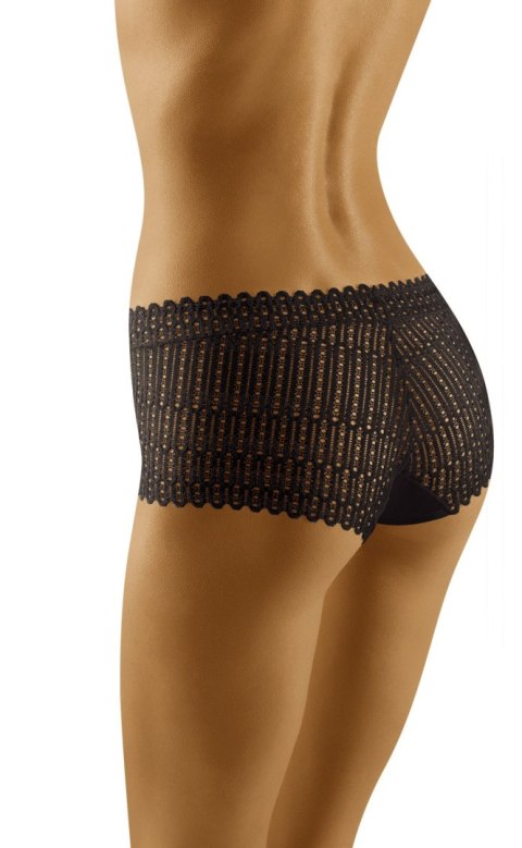 Efektowne figi niemal całkowicie wykonane z koronki. Krój a'la szorty. Tył i boki ażurowe, delikatne, bardzo kobiece. Przód uzupełnia wstawka z gładkiej, komfortowej tkaniny, która nie prześwituje. Skład: 83% poliamid, 17% elastan.