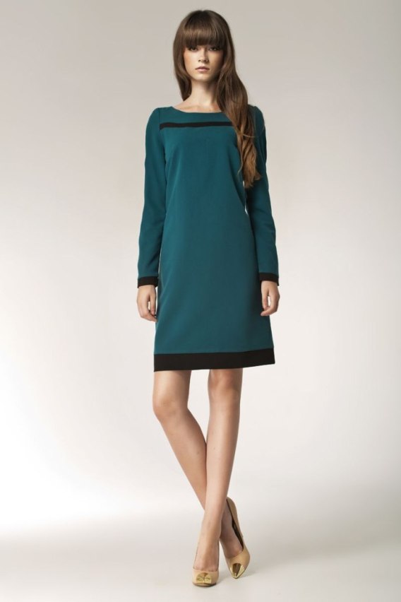 Wymarzona sukienka wszystkich miłośniczek retro! Długi rękaw spisze się podczas chłodniejszych dni. Prosto ścięty dekolt ozdobiony czarną lamówką podkreśla linię ramion. Delikatnie rozchodząca się ku dołu doda sylwetce lekkości. Ciemniejsza wstawka u dołu, akcentuje uda. Piękny szmaragdowy kolor to hit tego sezonu!