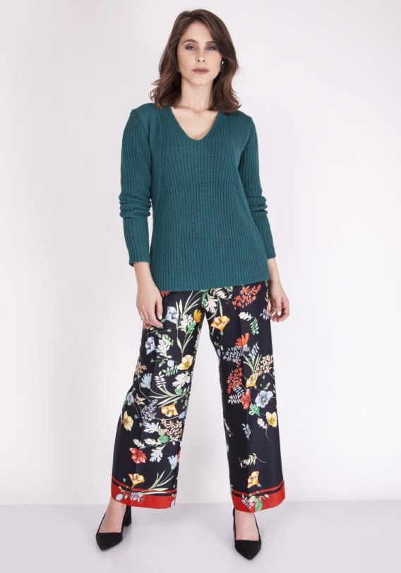 Elegancki i zarazem uniwersalny sweter z miękkiej przędzy. Podkrój typu "V" - atrakcyjnie modeluje linię dekoltu i ramion, sprawia, że sylwetka prezentuje się kobieco i bardzo zgrabnie. Przód sweterka z delikatnym splotem. Bardzo ładny kolor. Produkt polskiej marki MKM. Skład: 90% akryl, 10% poliamid.