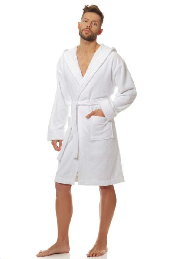 Wysokiej jakości, bawełniany, męski szlafrok z kapturem, wygodnie wiązany w pasie. Klasyczny, dobry krój z dwoma kieszeniami po bokach. Jasny, biały kolor, który świetnie wygląda i perfekcyjnie dopełni każdą łazienkę. Propozycja idealna także na prezent. Skład: 100% bawełna.